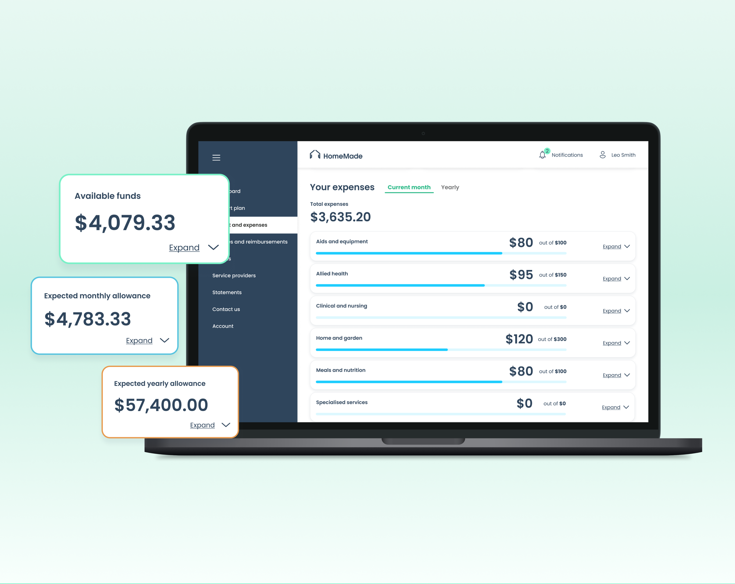 The online platform provides visibility of customer available funds, forecast of their home-care needs in monthly and yearly basis. Customers are also able to get an insight into their expenses and track where their money go.